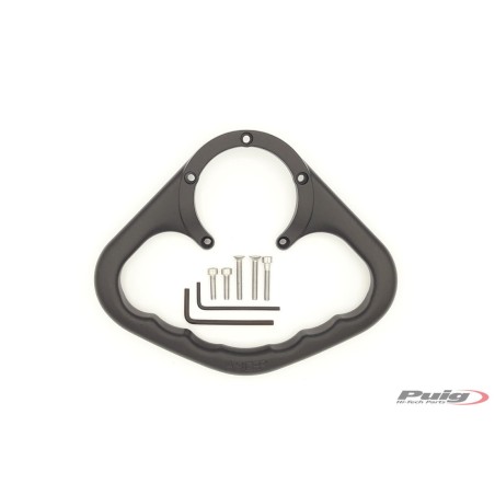 Los asideros son fijados, mediante tornillos, al tapón del depósito de la moto. El modelo que mejor encaje con su vehículo lo determinará el número de tornillos necesarios para la fijación al tapón del depósito. Es recomendable que se compruebe el número de tornillos para la fijación de la pieza en su moto antes de efectuar la compra del producto