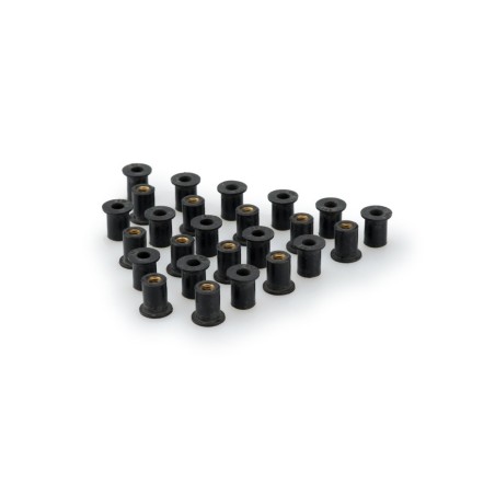 Los silentblocks de Puig ofrecen la máxima capacidad de absorción de las vibraciones de la moto. Con el paso del tiempo y de los kilómetros, los silentblocks de origen pierden su elasticidad y su capacidad de amortiguar las vibraciones, lo que provoca una notable reducción del confort de marcha y la aparición de ruidos molestos. Con los silenblocks de nuestro catálogo, se solucionan por completo estos problemas y se recupera la finura de funcionamiento de la moto. Son universales, con múltiples aplicaciones, y están disponibles sin tornillo y con tornillo, en varias medidas. Se suministran en bolsas de 25 unidades.