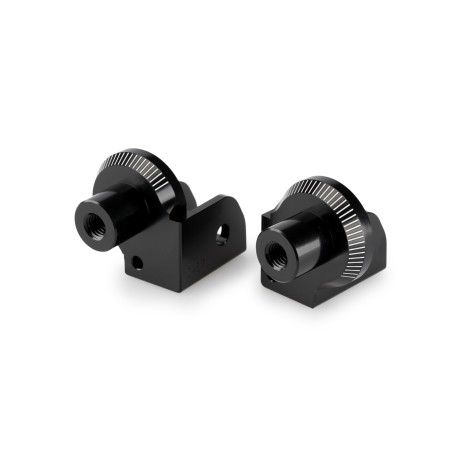 Herrajes mecanizados a partir de un bloque de aluminio Ergal 7075 de altas prestaciones y anodizados en color negro. Son la transmisión perfecta para conectar nuestras estriberas con los soportes originales de la motocicleta.