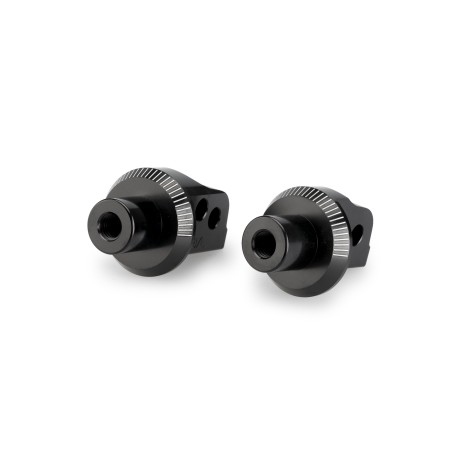 Herrajes mecanizados a partir de un bloque de aluminio Ergal 7075 de altas prestaciones y anodizados en color negro. Son la transmisión perfecta para conectar nuestras estriberas con los soportes originales de la motocicleta.