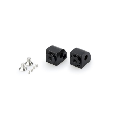 Herrajes mecanizados a partir de un bloque de aluminio Ergal 7075 de altas prestaciones y anodizados en color negro. Son la transmisión perfecta para conectar nuestras estriberas con los soportes originales de la motocicleta.